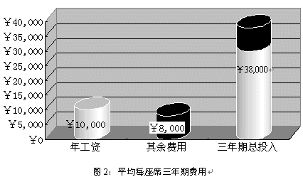 就中國目前的經(jīng)濟水平而言,一個座席人員年收入(包括工資、獎金、福利等等)大約為¥10,000,而每個座席人員所配備的軟硬件設(shè)施合計約為¥5,000;據(jù)專業(yè)機構(gòu)統(tǒng)計,中國的座席人員平均穩(wěn)定的工作年限為三年,而在這三年為了保證座席人員能夠準(zhǔn)確、高效的實現(xiàn)對用戶提供專業(yè)服務(wù),所投入的培訓(xùn)費用大約為¥3,000。所以在三年期間為每個座席的平均花費為¥38,000。