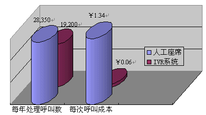 據(jù)統(tǒng)計,一個72線的IVR系統(tǒng)每年能夠處理2,300,000的接入電話,平均每線IVR一年能夠處理32,000個接入電話,依照60%的有效話務(wù)處理率(即80%的接入電話可以不轉(zhuǎn)人工即可完成服務(wù))來計算,即四年期每線的投入¥4569總共可以處理76,800個電話,即便是計算上系統(tǒng)維護(hù)費用,平均處理每個電話的成本僅為0.06元。