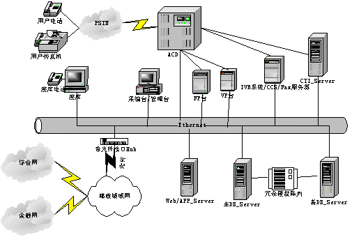 呼叫中心的功能主要有兩方面,一是與用戶進行交互,另外與金融主機房進行數(shù)據(jù)交互。呼叫中心系統(tǒng)由兩部分組成:聲訊平臺(CALL CENTER)和業(yè)務數(shù)據(jù)計算機網(wǎng)絡(luò)平臺。聲訊平臺由話務接入設(shè)備(ACD)、IVR系統(tǒng)和CTI服務器組成,主要負責語音資源的管理、呼入話務的排隊、自動業(yè)務以及人工座席的管理等;業(yè)務數(shù)據(jù)計算機網(wǎng)絡(luò)平臺是對業(yè)務數(shù)據(jù)的收集、使用、管理、分析等。平臺間通過CTI技術(shù)實現(xiàn)數(shù)字數(shù)據(jù)和語音數(shù)據(jù)的相互轉(zhuǎn)換和同步轉(zhuǎn)移。系統(tǒng)結(jié)構(gòu)如下。