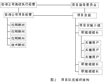 這支隊(duì)伍既有企業(yè)高級(jí)管理層所組成的指導(dǎo)委員會(huì)和咨詢公司人員,也有來自信息部門的技術(shù)人員和相應(yīng)職能部門的熟悉企業(yè)流程的業(yè)務(wù)人員所組成的實(shí)施小組和職能小組。項(xiàng)目隊(duì)伍組織結(jié)構(gòu)如圖2所示。