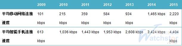 2009年到2010年一年間,平均移動網(wǎng)絡(luò)連接速度提升一倍,預(yù)期到2015年將會增加10倍。移動網(wǎng)絡(luò)連接速度是支持移動數(shù)據(jù)增長的主要因素。
