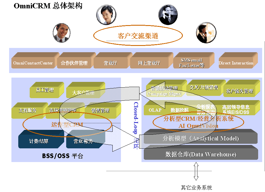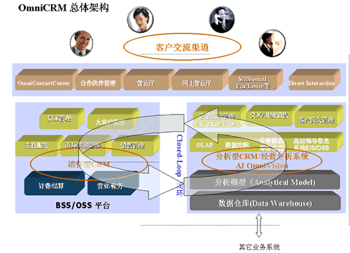 OmniCRM方案是亞信基于多年服務(wù)電信市場(chǎng)的豐富的行業(yè)經(jīng)驗(yàn),以及對(duì)國(guó)內(nèi)運(yùn)營(yíng)商業(yè)務(wù)發(fā)展的深刻認(rèn)識(shí)而推出的,其中,AI OmniVision是OmniCRM方案中經(jīng)營(yíng)分析型CRM 的核心產(chǎn)品。AI OmniVision不僅符合行業(yè)業(yè)務(wù)規(guī)范,而且基于對(duì)客戶行為、競(jìng)爭(zhēng)環(huán)境,商業(yè)獲利率以及其他參數(shù)的透徹分析,能夠使運(yùn)營(yíng)商充分了解現(xiàn)有客戶、識(shí)別并關(guān)注贏利的客戶組、提高服務(wù)質(zhì)量、確?蛻魸M意度和忠誠(chéng)度;同時(shí)吸引潛在的客戶;加強(qiáng)提供新服務(wù)的投資回報(bào)率;提高效率、減小成本,以實(shí)現(xiàn)業(yè)務(wù)價(jià)值的最大化。AI OmniVision采用數(shù)據(jù)倉(cāng)庫(kù)、ETL、OLAP分析、靈活報(bào)表展現(xiàn)及數(shù)據(jù)挖掘等技術(shù),包含了用戶分析、業(yè)務(wù)分析、收益分析、大客戶分析、營(yíng)銷分析、競(jìng)爭(zhēng)分析、服務(wù)質(zhì)量、新業(yè)務(wù)分析等眾多功能模塊。