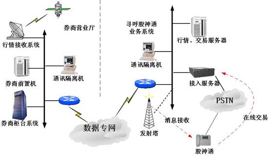 最終我們的設(shè)想是類似于呼叫中心的外包方式,由尋呼臺(tái)建立一套短訊接入系統(tǒng),并與券商的交易系統(tǒng)聯(lián)網(wǎng)(通過交易前置機(jī)),各券商租用部分資源,同時(shí)給他們的股民提供股神通話機(jī),股民們一方面可通過尋呼臺(tái)的無線資源接收股市信息,另一方面可以通過電話線接入尋呼的交易系統(tǒng)進(jìn)行交易。