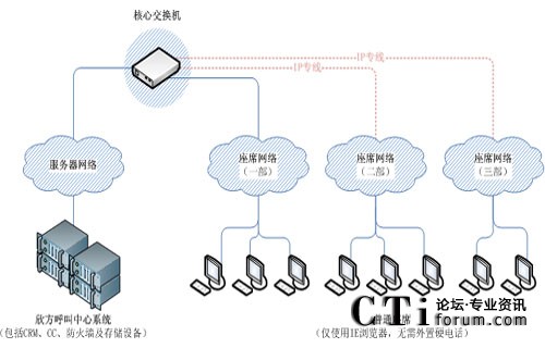 河北博岳呼叫中心職場(chǎng)分為1個(gè)中心職場(chǎng)和2個(gè)分部,之間相隔幾公里至幾十公里,以VoIP通路連接,所有職場(chǎng)統(tǒng)一管理,最大程度的適應(yīng)了呼叫中心建設(shè)的個(gè)性化需求,同時(shí),這種布局還大大降低了租用場(chǎng)地的成本,也方便話務(wù)員就近上班。