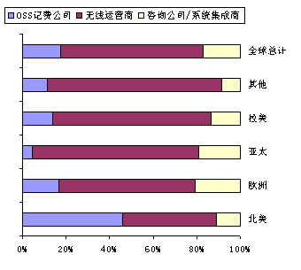 圖1、無(wú)線OSS計(jì)費(fèi)市場(chǎng):2000年全球按照地區(qū)劃分的不同公司類型的整體市場(chǎng)收入估計(jì)(百萬(wàn)美元)