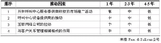 表二羅列了推動(dòng)中國外包呼叫中心服務(wù)市場(chǎng)發(fā)展的主要因素。