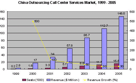 Frost & Sullivan公司研究表明在2000年,中國外包呼叫中心服務(wù)市場(chǎng)價(jià)值1700萬美元,共有1600坐席。本座席數(shù)是按照實(shí)際工作量來計(jì)算的,物理上存在的坐席數(shù)要超過2300個(gè)。因?yàn)樵S多坐席是在2000年下半年末才建成投入使用的,并且工作任務(wù)也沒有滿負(fù)荷。