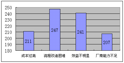 b)流程改造困難,對(duì)這個(gè)困難的擔(dān)心的企業(yè)數(shù)量最多,考慮到國內(nèi)企業(yè)的現(xiàn)實(shí)管理問題,流程改造必然與現(xiàn)實(shí)的利益發(fā)生矛盾,引起的阻力不可輕視。