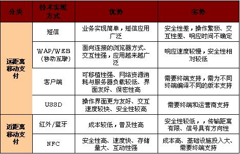 移動(dòng)支付(Mobile payment)包括遠(yuǎn)距離方式和近距離方式。遠(yuǎn)距離移動(dòng)支付的主要技術(shù)實(shí)現(xiàn)方式有SMS、WAP、客戶(hù)端(手機(jī)軟件)和USSD;近距離移動(dòng)支付的主要技術(shù)實(shí)現(xiàn)方式有紅外和NFC。各種移動(dòng)支付業(yè)務(wù)技術(shù)實(shí)現(xiàn)方式優(yōu)劣勢(shì)比較詳見(jiàn)圖表1。