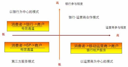 從產(chǎn)業(yè)鏈環(huán)節(jié)上看,移動(dòng)支付的主要參與者主要包括:消費(fèi)者、平臺(tái)提供商、銀行、運(yùn)營(yíng)商和商戶(hù)。其中,銀行和運(yùn)營(yíng)商在其中具有較高的談判能力。因此,可以按照這兩者在產(chǎn)業(yè)鏈中的參與程度,劃分移動(dòng)支付的商業(yè)模式?偟膩(lái)說(shuō),銀行機(jī)構(gòu)管理著廣大用戶(hù)的資金帳戶(hù),擁有完善的支付體系,在支付領(lǐng)域具有天然的用戶(hù)信任。運(yùn)營(yíng)商則擁有完備的網(wǎng)絡(luò)設(shè)施和先進(jìn)的IT系統(tǒng),通過(guò)定制終端,運(yùn)營(yíng)商可以將各種先進(jìn)的移動(dòng)應(yīng)用提供給用戶(hù),使用戶(hù)獲得良好的移動(dòng)化生活體驗(yàn)。因此,運(yùn)營(yíng)商在這方面具有較好的用戶(hù)資源和營(yíng)銷(xiāo)渠道。