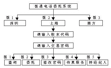 通過該項服務(wù),股民可以在任何地點使用任何一部雙音頻電話方便的向證券公司發(fā)出買入、賣出等各種委托指令,也可以發(fā)出查詢指令,證券公司的電話委托交易系統(tǒng)根據(jù)股民的指令自動完成委托及查詢操作,將結(jié)果反饋給股民。股民發(fā)給證券公司的信息,主要為數(shù)碼、數(shù)字,通過雙音頻電話按鍵來傳送。證券公司電話委托交易系統(tǒng)發(fā)給股民的信息,則是用語音傳送的操作及查詢結(jié)果。通過功能擴(kuò)充,還可提供其它配套服務(wù),如將查詢結(jié)果發(fā)送至股民的傳真機(jī)。若股民利用計算機(jī)接至委托公司,還可享受可視委托等更為多樣的服務(wù)。