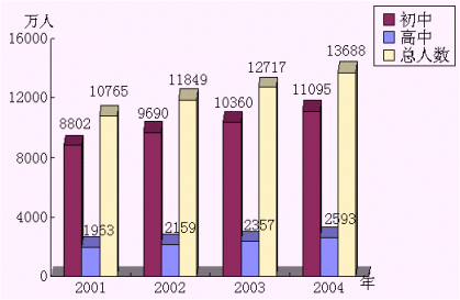2001年,中國大陸中學學生人數已達10765萬人,而且學生人數還在快速增長。初中學生人數以每年6.5%的速度增長,普通高中學生人數也以每年10%-11%的速度增長?梢钥闯觯逃袌鼍薮蟮臐摿蜕虣C。