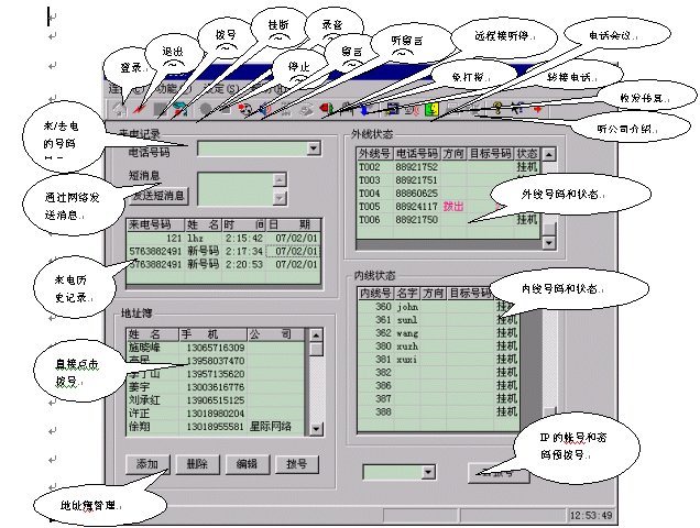 電話控制臺(軟電話),所有系統(tǒng)操作包括電話、查詢、短消息等等都可以通過鍵盤、鼠標(biāo)操作完成: