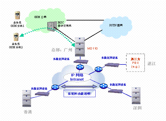 同時,在公司總部, 用愛立信MD110替換原有交換機,并與廣東移動直接相連,總部配180個設定不同的權限級別的ME(移動分機),使經(jīng)常在外辦理業(yè)務的人員的手機號被注冊為總部交換機的一個移動分機。廣東移動為所有移動分機提供特殊價格。