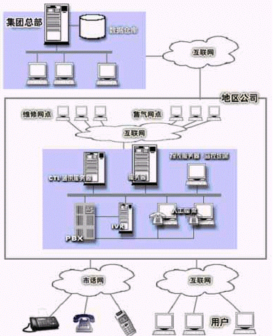 各地區(qū)系統(tǒng)通過互聯(lián)網(wǎng)和下屬維修網(wǎng)點(diǎn)、銷售網(wǎng)點(diǎn)相連,構(gòu)成一個(gè)地區(qū)性服務(wù)網(wǎng)絡(luò)。各地區(qū)系統(tǒng)通過互聯(lián)網(wǎng)和集團(tuán)總部連接,構(gòu)成信息收集網(wǎng)絡(luò)。前者支持業(yè)務(wù)服務(wù),后者支持管理決策,共同構(gòu)成綜合公用事業(yè)服務(wù)平臺(tái)。