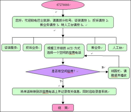 電話受理流程中的每一項業(yè)務(wù)均可以實現(xiàn)自動式語音應(yīng)答,自動索取傳真資料,人工服務(wù)等功能,其中,投訴業(yè)務(wù)既可以實現(xiàn)人工受理,也能夠完成系統(tǒng)自動受理。