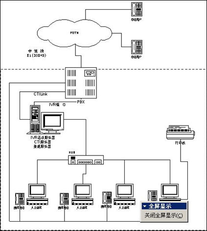 系統(tǒng)目前共設(shè)置了多個人工座席,每個人工座席有電腦一臺,耳機式電話一部。人工座席的電腦與CTI,IVR語音服務(wù)器及數(shù)據(jù)庫服務(wù)器共處一個局域網(wǎng)內(nèi)。