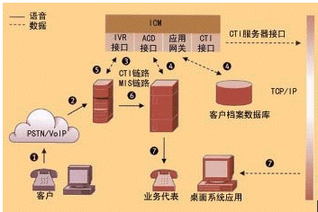 CTI (Computer Telephony Integration 計算機電信集成) 技術將計算機網(wǎng)和電話網(wǎng)連接在一起,把語音和數(shù)據(jù)服務集成為一體,使得構造數(shù)據(jù)和語音的融合應用得以實現(xiàn)。例如,由于CTI技術的引入,當用戶來話時,呼叫中心能根據(jù)用戶的呼叫信息如ANI(主叫號)結合數(shù)據(jù)庫迅速地識別用戶,實現(xiàn)“彈屏”功能;當電話轉接時,實現(xiàn)語音數(shù)據(jù)的同步轉移;根據(jù)所獲得的客戶信息及其他相關信息將來話路由到最適合服務的座席等。CTI技術包含了數(shù)據(jù)通信與語音通信兩大部分的內容,關注的不僅僅是將基于計算機的智能技術運用到電話的發(fā)送、接收及管理,還要考慮各種媒體類型的信息傳送,包括實時信號和非實時信號,如傳真、電子郵件和視頻信號等。