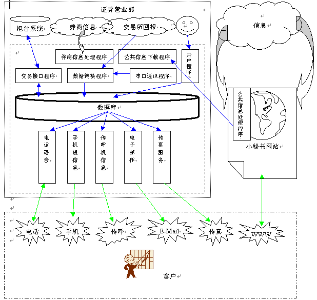 面對越來越激烈的競爭,各個券商使出渾身解數(shù),推出如透支、手續(xù)費返還等各種吸引客戶的手段;運用各種各樣的的交易方式如:營業(yè)部大戶室、家庭遠(yuǎn)程大戶室、網(wǎng)上交易、電話委托以及手機(jī)炒股、股易通、WAP網(wǎng)上交易等等。然而,這些都屬于被動的服務(wù)方式,對于業(yè)余炒股的大多數(shù)中小戶、散戶來說,不可能每天花數(shù)小時瀏覽股市的各種信息。因此,不知道配股繳款、錯過配售新股等情況時有發(fā)生,給客戶造成較大的經(jīng)濟(jì)損失;一些重大消息、重大新聞不能及時獲知,延誤了投資的有利時機(jī)。據(jù)調(diào)查,目前參加二級市場配售的投資者比例不足20%。