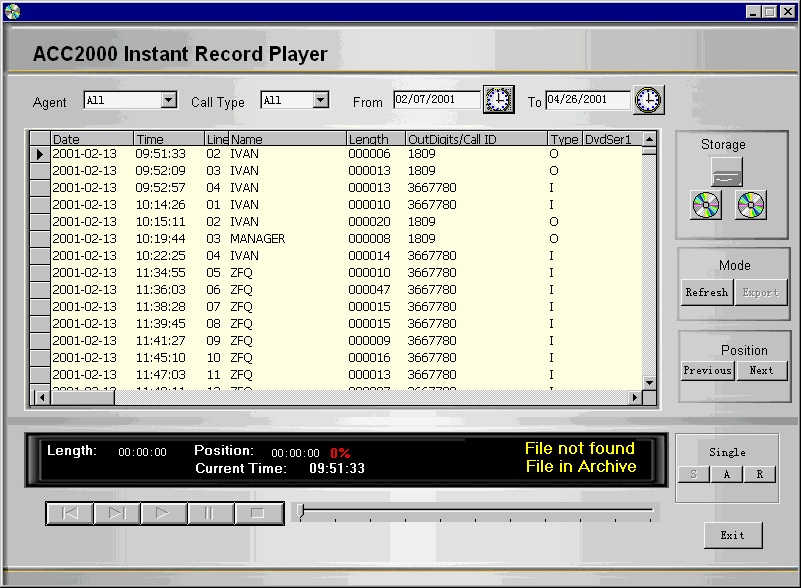 ACC2000 多媒體溝通中心采用最先進(jìn)的海量存儲設(shè)備DVD RAM構(gòu)建實(shí)時(shí)多通道語音錄制、備份系統(tǒng)��ACC2000 DVD Record Backup。這個(gè)系統(tǒng)可以根據(jù)管理員設(shè)定的錄音對象,對符合錄音條件的通話自動進(jìn)行錄音。
