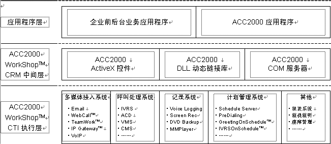 ACC2000 Workshop將基于CTI技術(shù)、功能相對(duì)獨(dú)立的CTI執(zhí)行系統(tǒng)從個(gè)性化的CRM解決方案中分離出來(lái),并通過(guò)ACC2000 Workshop的CRM中間層將其功能開放給CRM應(yīng)用程序,從而構(gòu)建了一個(gè)完全開放的呼叫中心開發(fā)平臺(tái),這是ACC2000相對(duì)于其他呼叫中心解決方案最具優(yōu)勢(shì)的特點(diǎn)之一。
