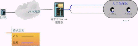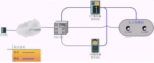上圖是客服中心較常見的結構圖,相當于將初級客服的CT-Server服務器一分為三。原來的語音板卡由現在真正的PBX替代,青牛USE和青牛ATS則是從CT-Server軟件包中獨立出來,強化各自的核心功能,運行在兩臺單獨的服務器上(IVR服務器還是需要語音板卡來處理話路,但語音板卡已經不負責PBX的交換功能了)。這種類型的客服中心可以給客戶更大規(guī)模的、更穩(wěn)定的服務,并且撥入電話的客戶感覺不到系統(tǒng)的變化。