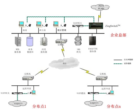 - 系統(tǒng)仍可同時在總部設立VoIP中心,用以實現(xiàn)數(shù)據(jù)和管理的集中,并且采用VoIP的方式,對各分布點的話務工作進行集中的監(jiān)控。