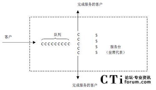 呼叫中心是一個(gè)典型的排隊(duì)系統(tǒng)。電話一個(gè)接著一個(gè)到來(lái),接受各種服務(wù)。如果一個(gè)到達(dá)的客戶不能立即接受服務(wù),這個(gè)客戶就加入到一個(gè)隊(duì)列中進(jìn)行等待,圖示是一個(gè)單隊(duì)列的排隊(duì)模型,如果呼叫中心擁有多個(gè)隊(duì)列,則需要構(gòu)造多個(gè)上述的排隊(duì)模型。