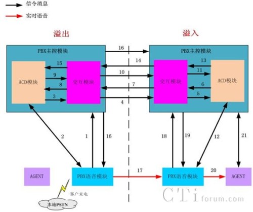 通過PBX/ACD建立一種電話路由共享和語音溢出的方法,實(shí)現(xiàn)多套聯(lián)絡(luò)中心平臺之間語音的動態(tài)互溢,透明地為客戶提供優(yōu)質(zhì)、及時(shí)的電話服務(wù),客戶感覺不到任何差異。通過PBX/ACD建立一種電話路由共享和語音溢出的方法,作為行業(yè)現(xiàn)有實(shí)現(xiàn)方法的有效補(bǔ)充,解決了行業(yè)現(xiàn)有實(shí)現(xiàn)方法的無法實(shí)現(xiàn)最短路徑溢出問題,通過ACD的“先排隊(duì)后進(jìn)門”的預(yù)約預(yù)定模式,動態(tài)判斷彼此的運(yùn)行狀態(tài)和處理能力,無需先將語音溢出到另外一個(gè)聯(lián)絡(luò)中心,只有當(dāng)另外一個(gè)聯(lián)絡(luò)中心確定能提供相應(yīng)的語音服務(wù)和人工服務(wù)的時(shí)候,語音才在PBX語音層面通過標(biāo)準(zhǔn)通信協(xié)議進(jìn)行互聯(lián)互通,避免實(shí)時(shí)語音被多次溢出,實(shí)時(shí)實(shí)時(shí)語音溢出只走最短路徑,保證客戶電話只需一次溢出就能立即提供語音服務(wù)和人工服務(wù),大幅減少了語音溢出的處理時(shí)間,同時(shí)也大幅減少了語音處理次數(shù),提升了系統(tǒng)處理性能。