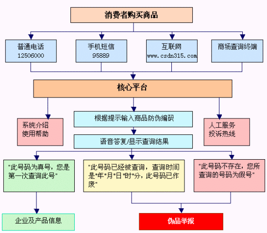 通過登錄www.csdn315.com,進行商品真?zhèn)蔚牟樵儯瑫r可以等到商品許多有用的相關(guān)信息。通過網(wǎng)站還將獲取防偽的相關(guān)資訊、購物指導(dǎo)性建議、國家有關(guān)的防偽法律知識;