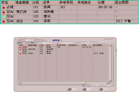 班長席子系統(tǒng)除了話務(wù)席子系統(tǒng)中所介紹的全部功能外,還具有監(jiān)聽、錄音、強拆電話、攔截呼叫、話務(wù)席監(jiān)控、話務(wù)工作量統(tǒng)計等座席管理功能。
