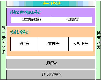2 )系統(tǒng)基于 J2EE架構(gòu),采取三層結(jié)構(gòu)設(shè)計,分為前端應(yīng)用(外部公共信息服務(wù)平臺)、應(yīng)用支撐平臺和系統(tǒng)軟硬件平臺,以應(yīng)用支撐平臺為核心,以安全和標(biāo)準(zhǔn)為保證。