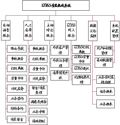 系統(tǒng)主要功能有:事故報告、打假舉報、質(zhì)量申訴、行風(fēng)監(jiān)督、業(yè)務(wù)咨詢、防偽查詢、主動呼出、網(wǎng)上服務(wù)、統(tǒng)計分析、數(shù)據(jù)匯總監(jiān)控等。