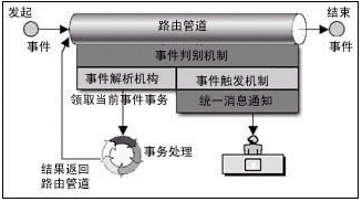 在路由管道中流轉(zhuǎn)著加載了業(yè)務(wù)的工作流事件。事件按照事先定義的路由規(guī)則流轉(zhuǎn),事件的路由規(guī)則定義了事件在路由管道中可以?康摹罢九_”,同時定義了事件到達(dá)“站臺”時可以領(lǐng)取并處理加載在事件上的業(yè)務(wù)的角色。事件從始發(fā)站臺進(jìn)入路由管道,經(jīng)過一個或多個中間站臺,最后到達(dá)終點站。事件每?恳粋站臺,相關(guān)人員領(lǐng)取事務(wù),并進(jìn)行處理后重新裝載事務(wù),觸發(fā)事件向下一個站臺流轉(zhuǎn),除非事件已經(jīng)到達(dá)終點站。