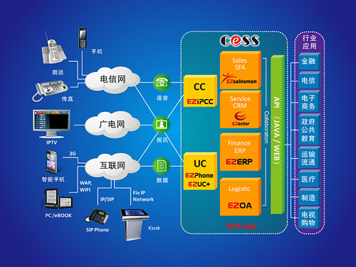 上圖: 三網(wǎng)融合下億迅的新一代客服中心可實現(xiàn)多元企企聯(lián)盟的商務活動