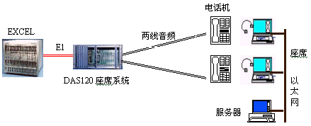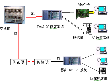 見下圖:DAS120主機通過4個E1接口與交換機直接連接,可方便地實現(xiàn)本地座席接入。遠端分布式接入則需要通過傳輸設備,它們可為光纖,微波,HDSL等。終端可為座席卡和電話機。