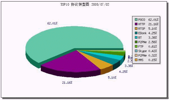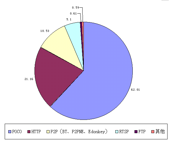 - 監(jiān)控時(shí)間段內(nèi),POCO流量占62.01%,HTTP占21.16%,RTSP(在線視頻)占5.1%,P2P業(yè)務(wù)(包括EDonkey、P2PNE、BT等)占10.53%,F(xiàn)TP為0.61%,其他業(yè)務(wù)不到0.59%。如下圖: