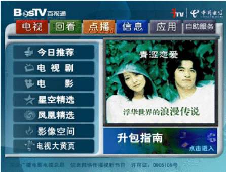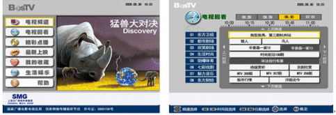 上海IPTV業(yè)務(wù)自2006年9月1日放號(hào)以來,發(fā)展十分迅速。截止10月7日,上海電信IPTV業(yè)務(wù)共計(jì)發(fā)展用戶達(dá)2.2萬。如下是上海IPTV商用系統(tǒng)EPG頁面:
