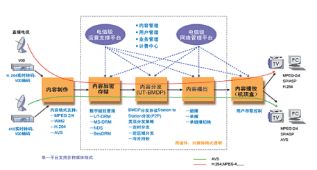 奔流(RollingStream)系統(tǒng)為IPTV業(yè)務(wù)提供了端到端的業(yè)務(wù)解決方案,先進(jìn)的系統(tǒng)架構(gòu)對Codec完全透明,可透明支持AVS,如下圖。奔流(RollingStream)系統(tǒng)包括內(nèi)容制作、內(nèi)容存儲(chǔ)/加密、內(nèi)容分發(fā)、內(nèi)容播放、終端顯示的各個(gè)方面,都可提供基于電信級(jí)的解決方案。