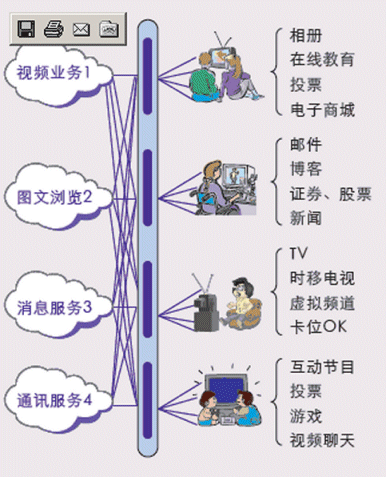 - 豐富多彩的互動(dòng)增值業(yè)務(wù): 可視電話、電視短信、電視競猜、電視投票、游戲、信息瀏覽等