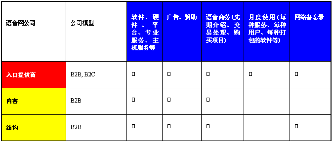 許多語(yǔ)音入口提供商向個(gè)人和公司提供語(yǔ)音網(wǎng)上的服務(wù),而內(nèi)容和結(jié)構(gòu)公司則向這些入口提供商提供技術(shù)支持、產(chǎn)品和主機(jī)服務(wù)。