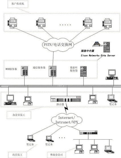 本系統(tǒng)采用最新的J2EE WEB技術(shù),在組成結(jié)構(gòu)上主要由以下三大模塊組成:1)WEB服務(wù)器: 完成用戶通過IE瀏覽器接入訪問, 傳真發(fā)送及接收的操作界面,傳真結(jié)果的查詢,客戶地址本的維護等工作;2)傳真發(fā)送/接收通信服務(wù)器:主要完成驅(qū)動傳真板卡,通過通信線路收發(fā)傳真,檢測通信線路、對方狀態(tài),發(fā)送接收隊列管理等工作;3)數(shù)據(jù)庫服務(wù)器:主要負責(zé)用戶信息,用戶地址本信息,傳真記錄等信息存儲工作。