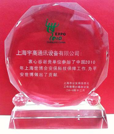 宇高通訊榮獲“2010世博安保貢獻(xiàn)獎(jiǎng)”