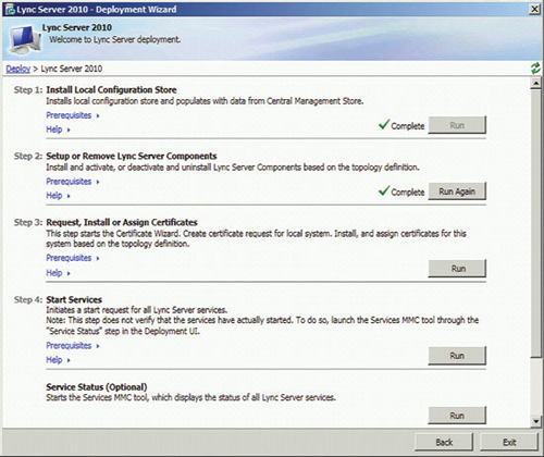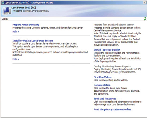 準(zhǔn)備好基礎(chǔ)結(jié)構(gòu)并發(fā)布拓?fù)浜,即可開始安裝前端服務(wù)器和服務(wù)器角色,以啟用 A/V 會議、企業(yè)語音、監(jiān)控、存檔及其他功能。準(zhǔn)備每臺服務(wù)器從運行部署向?qū)В▍⒁妶D 3)開始,但每個服務(wù)器角色都有自己的安裝和配置要求。您可以在 TechNet 庫的“部署 Lync Server 2010 Standard Edition”部分查找更多詳細(xì)信息。