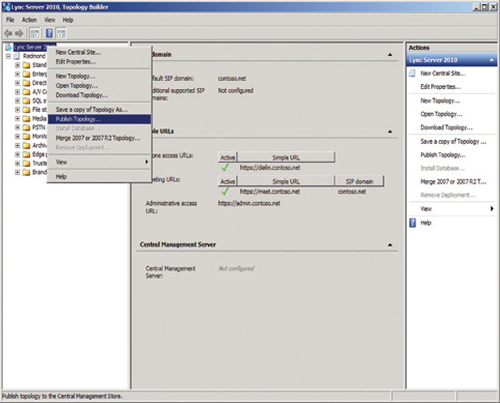 感到滿意后,可使用拓?fù)渖善鱽眚炞C拓?fù)。如果它作為有效拓(fù)渫ㄟ^驗證,則可以發(fā)布。發(fā)布拓?fù)鋾r,Lync Server 會將拓?fù)浯嫒胫醒牍芾泶鎯ΑH绻形磩?chuàng)建中央管理存儲,Lync 會在您提供有效拓?fù)洳?zhǔn)備發(fā)布拓?fù)鋾r創(chuàng)建中央管理存儲。在所處環(huán)境的各臺服務(wù)器上安裝 Lync Server 時,服務(wù)器會從中央管理存儲讀取拓?fù)洌惭b自身以配合其在您的部署中的角色。