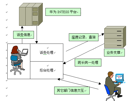 該系統(tǒng)在鐵通CRIS 平臺上運行,前端接入采用華為CC08-A型排隊機,華為INTESS平臺,集成正邦高科座席軟件。完成企業(yè)業(yè)務咨詢、投訴建議的受理、產(chǎn)品訂購、外呼調(diào)查等業(yè)務,并針對各業(yè)務的特色規(guī)劃了企業(yè)的業(yè)務流程。正邦高科客戶服務系統(tǒng)的坐席軟件,和華為INTESS采用緊耦合方式將話務信息和業(yè)務信息結合在一起,便于統(tǒng)計分析,制訂客戶服務中心的運營策略。在后臺業(yè)務管理系統(tǒng)中,客戶服務系統(tǒng)設計了便于分析業(yè)務的一系列統(tǒng)計報表,使企業(yè)可以方便地對銷售過程進行跟蹤和定單派發(fā)。