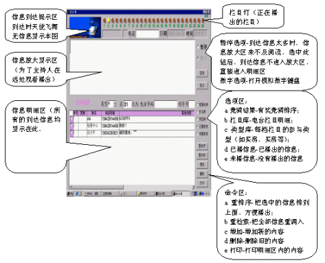 如果信息到達(dá)量過大,會導(dǎo)致信息放大區(qū)中的信息不斷被更新,此時,只要選中暫停選項(xiàng),信息放大區(qū)的信息就不會被更新。該信息播出后,如果需要播出明細(xì)區(qū)中的內(nèi)容,只要在明細(xì)區(qū)中用鼠標(biāo)左鍵雙擊該信息的信息內(nèi)容,該信息內(nèi)容立即上升到放大區(qū)中,同時該信息發(fā)送人的姓名、性別、電話、日期、時間會同時上升到放大區(qū)上方,而且該信息內(nèi)容會自動轉(zhuǎn)移到已播出信息中(這樣可以迅速明細(xì)區(qū)中的信息減少,方便主持人播出其他信息)。