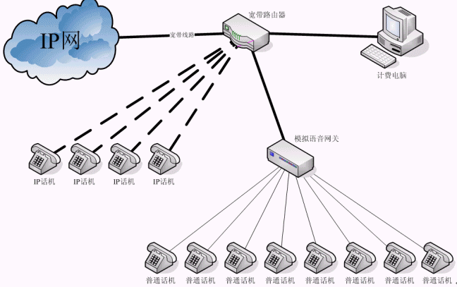 1、 最典型的IP話吧的聯(lián)接方式是寬帶線路連接寬帶路由器,計費電腦和模擬語音網(wǎng)關(guān)連接寬帶路由器,普通話機連接模擬語音網(wǎng)關(guān),通過計費電腦可以控制模擬語音網(wǎng)關(guān)上的各個話路,其操作包括開機、停機、計費和統(tǒng)計話費等。