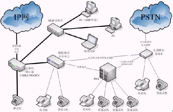 1、 數(shù)據(jù)線路直接連接IP話機、語音網(wǎng)關(guān)或安裝了軟電話(MSP)的PC或筆記本電腦,語音網(wǎng)關(guān)連接普通話機、傳真機或用戶端的PBX。