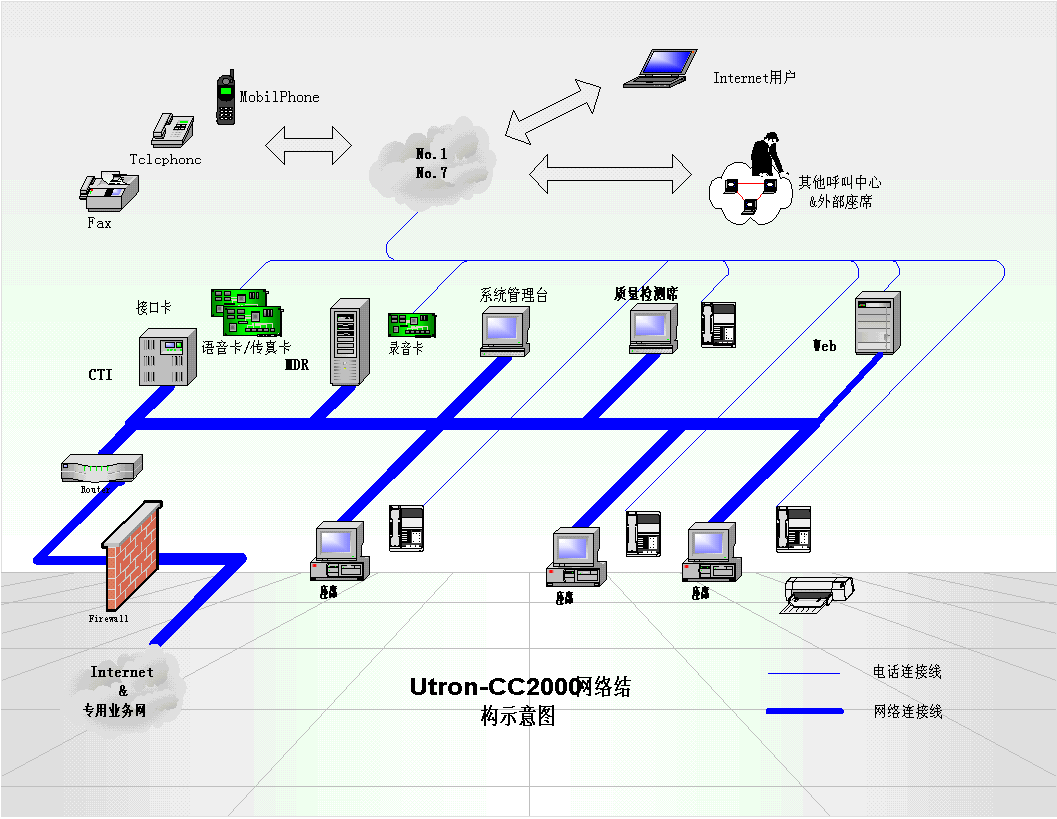 。。Utron-CC2000呼叫中心系統(tǒng)以其強大和靈活便捷的功能,優(yōu)良的性能價格比,能夠滿足日益發(fā)展的電信企業(yè)客戶服務的多方面要求,是為電信用戶提供高效率、全方位的周到服務,開展增值業(yè)務強有力的工具。